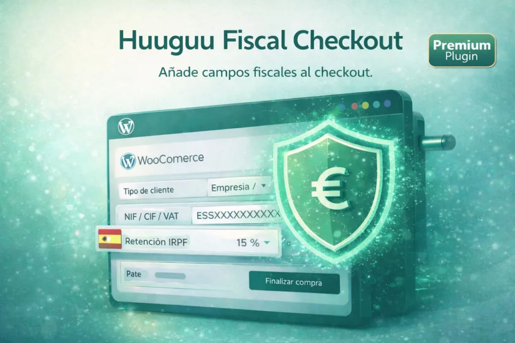 Añade campos fiscales al checkout. Y si usas Huuguu Service Product o Huuguu Schedule, aplica la retención de IRPF automáticamente.