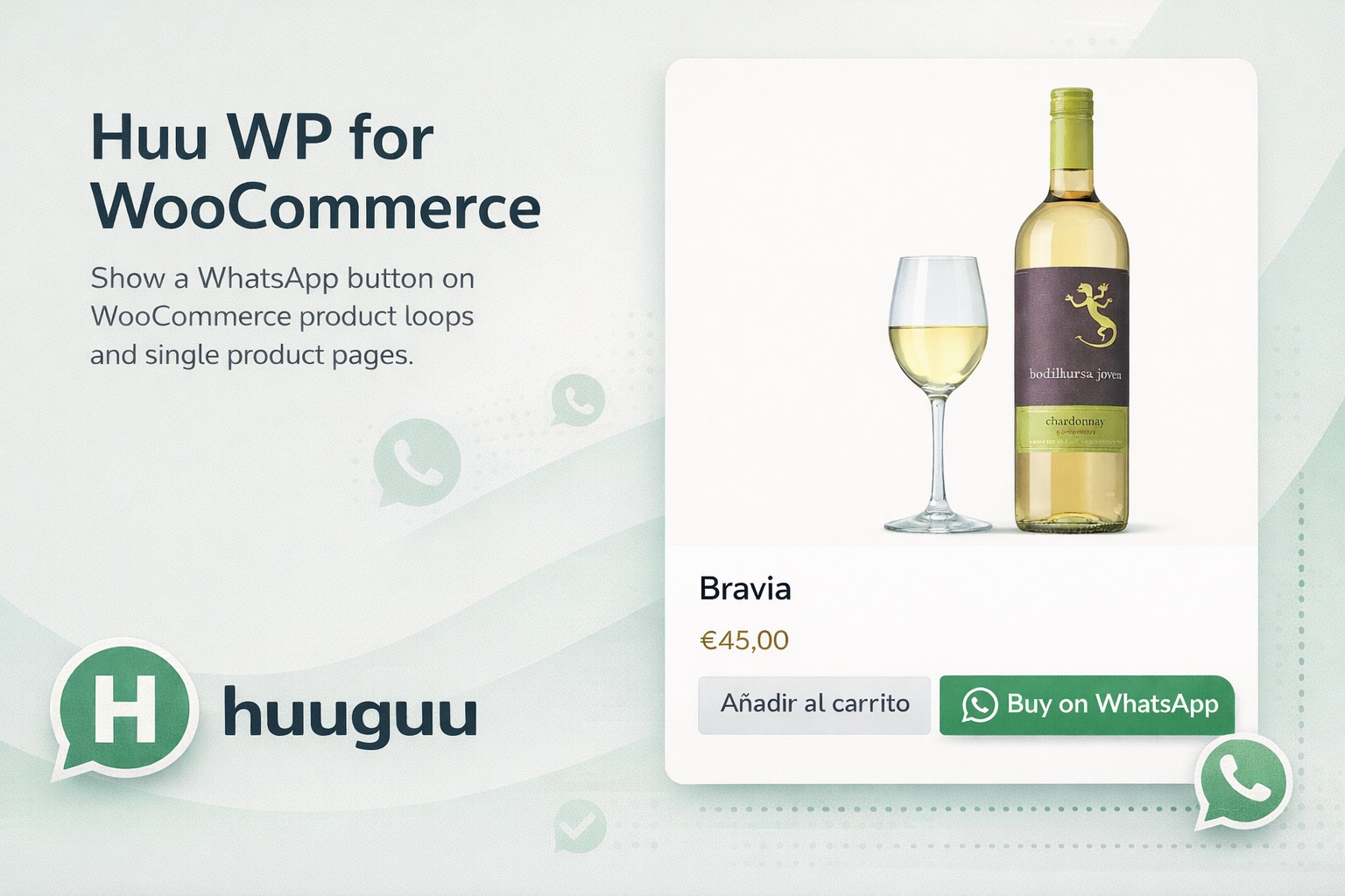 Huuguu WP for WooCommerce integra WhatsApp directamente en tu tienda WooCommerce añadiendo un botón de contacto en las páginas de producto y en los listados de productos.
