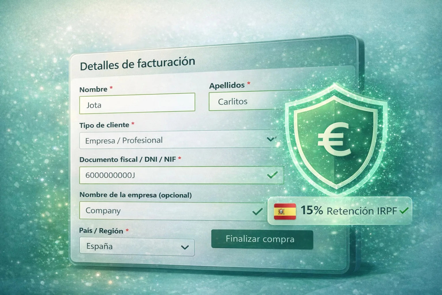 Cuando se detecta un entorno compatible, Huuguu Fiscal Checkout puede aplicar automáticamente la retención de IRPF para servicios profesionales en España.
